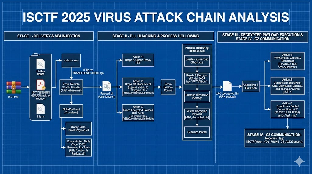 从 MSI Transform 注入、Dropper 释放和 DLL 劫持,再到 Process Hollowing 注入和 C2 通信,层层剖析 ISCTF 2025 病毒分析赛道题目。