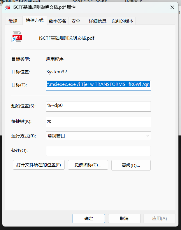 右键该 .lnk 文件并查看属性,可见其目标为 C:\Windows\System32\msiexec.exe /i Tje1w TRANSFORMS=fR6Wl /qn。