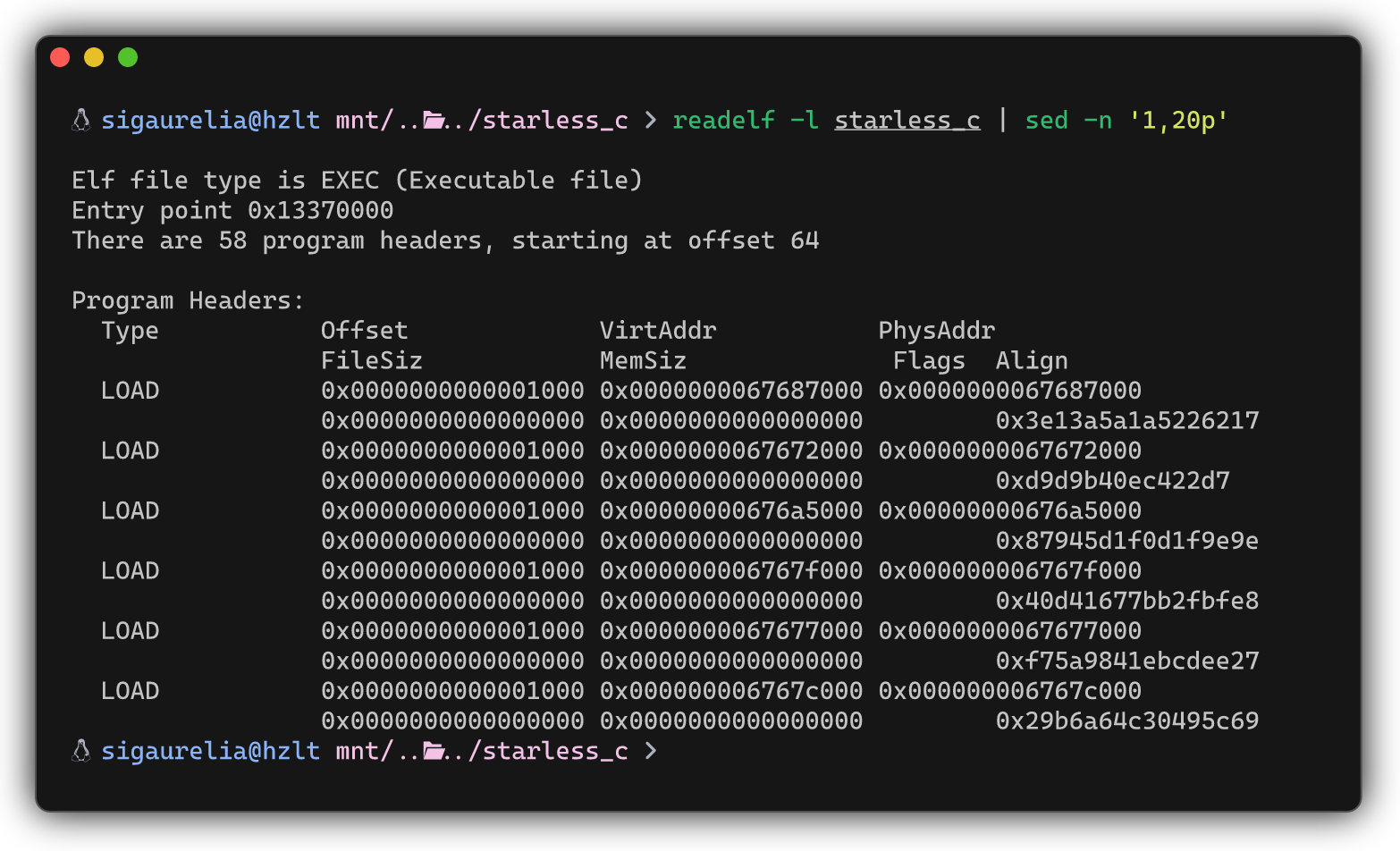 对于注意力欠佳的朋友,我们也可以通过 readelf 发现这一点。观察到 LOAD 段中大多数页的 Offset FileSiz 均为 0x1000。